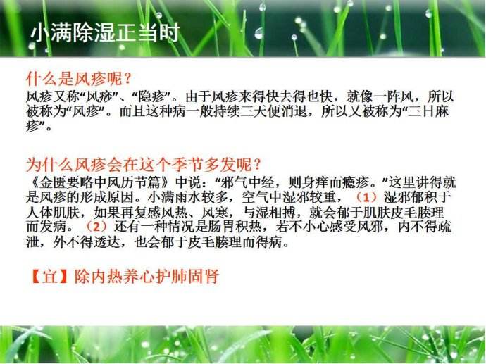 小滿(mǎn)及其后是濕性皮膚病和體濕病的易發(fā)期。《金匱要略·中風(fēng)歷節(jié)篇》中記載:“邪氣中經(jīng),則身癢而癮疹”。