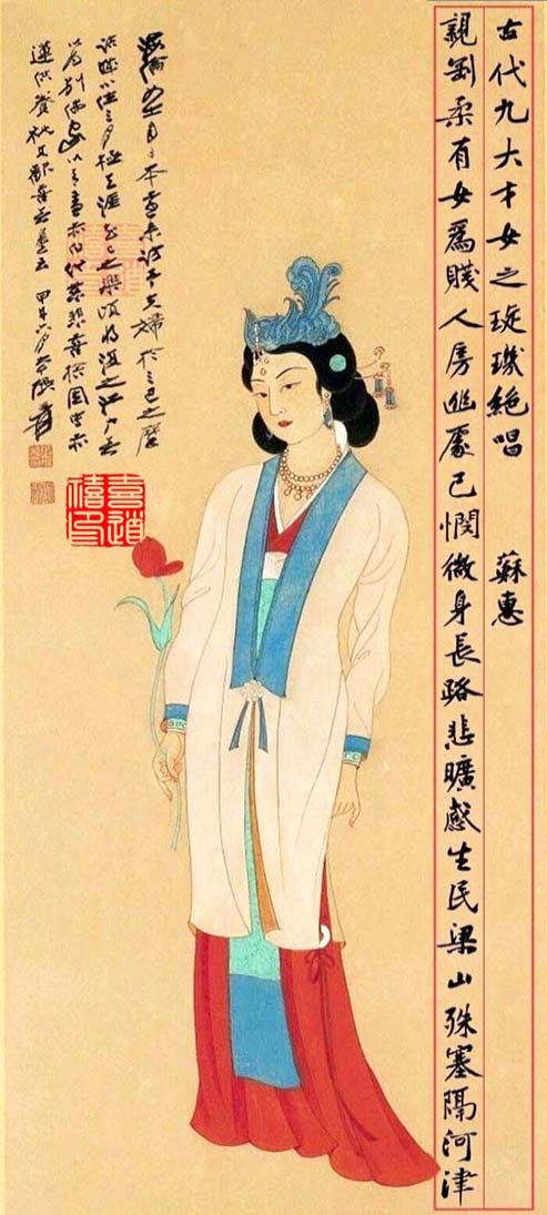 蘇惠,字若蘭,十六國時期東扶風(fēng)人(現(xiàn)今陜西咸陽武功人),生于公元357年。若蘭容貌秀麗,舉止嫻雅。其夫竇滔因厭戰(zhàn)違軍令,被貶配流沙,邂逅歌妓趙陽臺,納為偏房。后竇滔奉旨鎮(zhèn)襄陽,本欲攜妻妾同往,可蘇蕙為納妾之事情閾憤拒,竇惟攜妾赴任。蘇蕙孤守空閨,日久,甚感寂空難耐。其便吟詩作文以遣孤寂時光。