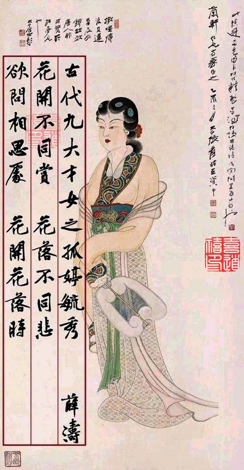 薛濤(約768~832年),字洪度,京兆長安(今西安)人。唐代女詩人,美曜玫瑰,華茂春松,成都樂師。16歲入樂籍,與韋皋、元稹有過戀情,薛濤自制桃紅色小箋用來寫詩傳情,后人仿制,稱“薛濤箋”。脫樂籍后,終身未嫁。