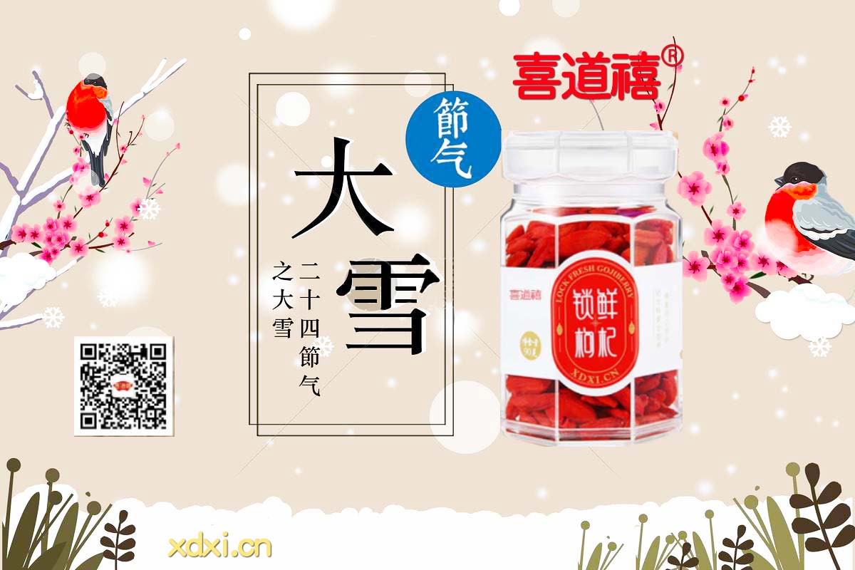 大雪節(jié)令養(yǎng)生,要注意精神調(diào)養(yǎng)。調(diào)養(yǎng)應(yīng)動(dòng)靜結(jié)合、勞逸結(jié)合、補(bǔ)瀉結(jié)合、形神共養(yǎng)。 飲食強(qiáng)調(diào)營養(yǎng)而食必進(jìn)補(bǔ),起居過于安逸靜養(yǎng),還以補(bǔ)益藥食同源者為佳,喜道禧枸杞是最佳首選。