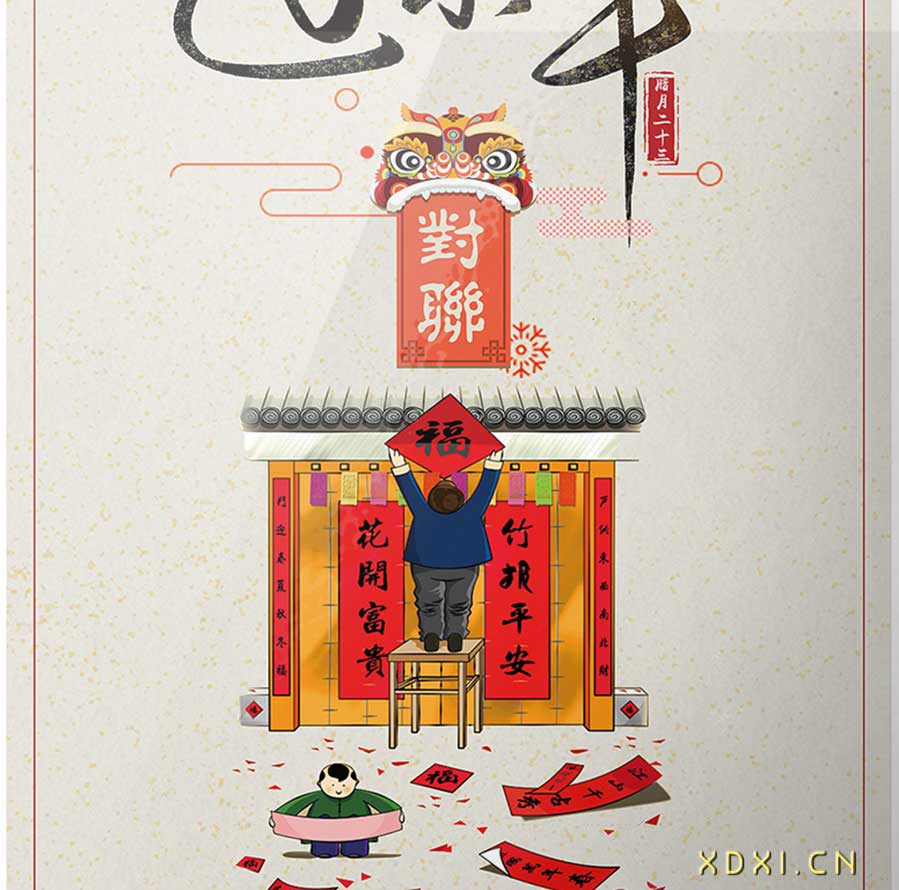 寫春聯(lián)也是小年的民俗活動(dòng)。春節(jié)時(shí),民間講究有神必貼,每門必貼,每物必貼。神靈前、大門上、井口、牲畜圈、面糧倉(cāng)、樹上,處處需要貼春聯(lián),內(nèi)容豐富,妙語(yǔ)連珠。