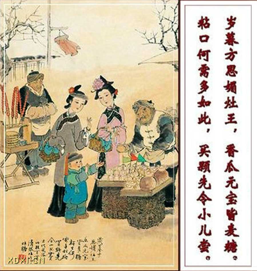祭灶之節(jié),拜謝灶王。呈清水,供糖果;扎草馬,備料糧。灶糖涂君口,焚像上天堂。祈上天而美言,愿回宮降吉祥。一朝灶王歸去,百事任爾張狂。九天東廚司命,一代灶王任承。千家萬(wàn)戶尊為主,一年四季理民情。