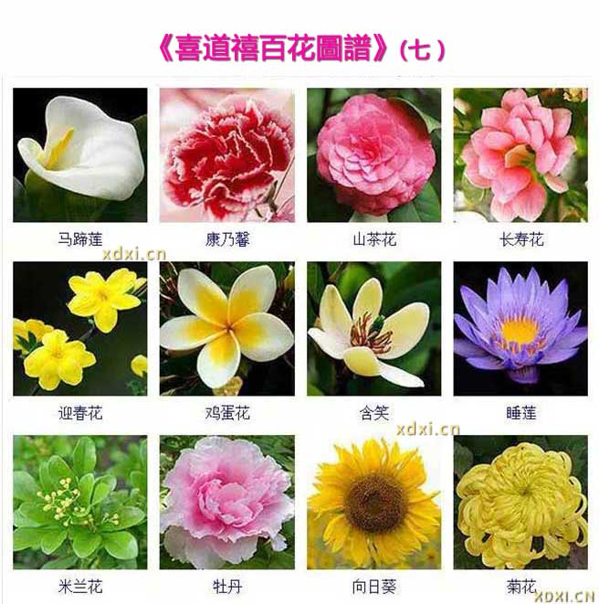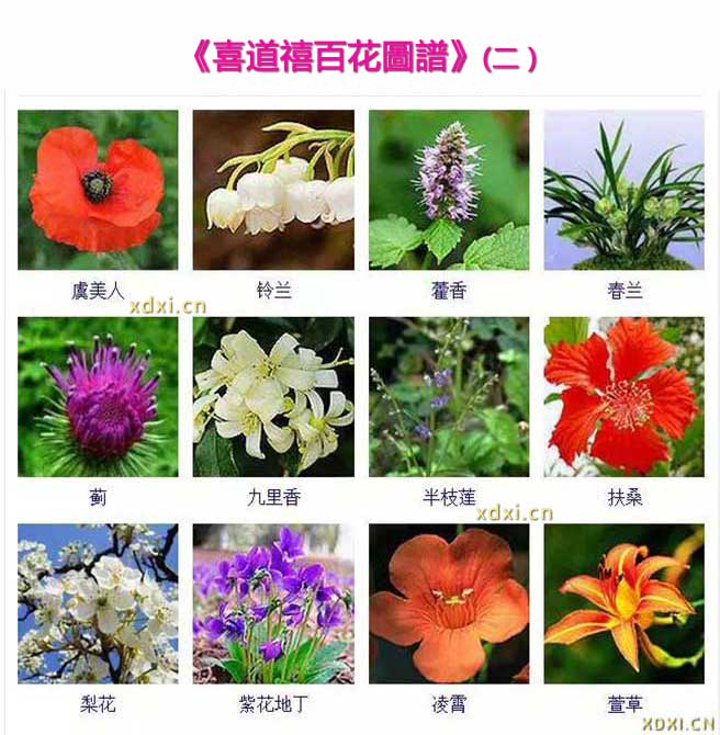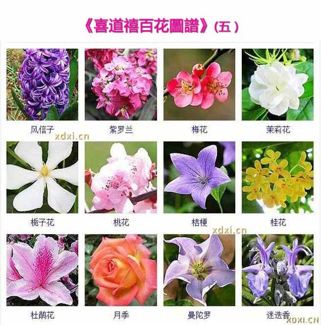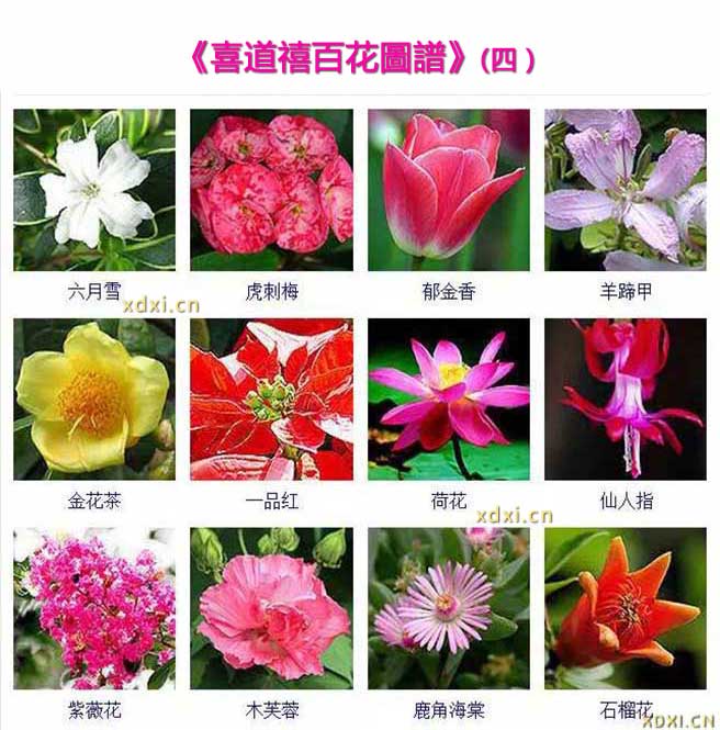 花友 (對各種花的雅稱) 、十二客 (對十二種名花的謔稱) 、玉英 (花的美稱) 、玉玲瓏 (花的別名) 、 瑤芳 (白色花朵的美稱)、 瓊苞 (花苞的美稱) 、玉葉 (花木葉子的美稱) 、木芍藥 (牡丹的別名)、 百兩金 (牡丹的別名)、 伊洛傳芳 (牡丹的別稱) 、花后 (牡丹的別名) 、貴客 (牡丹的別名)、 洛陽花 (牡丹的別稱) 、鹿韭 (牡丹的別名)、 雄紅 (牡丹的別名) 、賞客 (牡丹的別名) 、鼠姑 (牡丹的別名)、 醒酒花 (牡丹花的別名)、 京花 (千葉牡丹的別名) 、九英梅 (蠟梅的別名) 、久客 (臘梅的別名) 、小黃香 (蠟梅的別名)、 奇友 (蠟梅的別稱)、 黃梅花 (蠟梅的別名) 、寒客 (臘梅的異名) 、狂客 (楊花的別稱)、 一捻紅 (山茶花的別名) 、月丹 (山茶的別名)、 玉茗 (白山茶花的別稱)、 豐瑞花 (瑞圣花的別名) 、閨客 (瑞香花的別名) 、紫風(fēng)流 (麝囊花的別名)、 蓬萊紫 (瑞香花的別名) 、錦熏籠 (瑞香花的別名)、麝囊 (瑞香花的別名) 、僭客 (春花的別名) 、 百結(jié)花 (丁香的別名) 、素客 (丁香花的別名)、 情客 (丁香的別名) 、女郎花 (辛夷的別名)、 書客 (木筆花的名) 、新夷 (木蘭的別名)、 山石榴 (亦省稱“山榴”,杜鵑花的別稱)、 山客 (躑躅的雅稱) 、山躑躅 (杜鵑花的別名)、 紅躑躅 (紅杜鵑花的別稱)、 映山紅 (杜鵑花的別名)、 謝豹花 ( 杜鵑花的別名)、 躑 (杜鵑花的別名)、 躑躅 (杜鵑花的別名) 、拘那夷 (亦稱“拘兒”,夾竹桃的別名)、 俱那衛(wèi) (夾竹桃的別名)也叫俱那異、枸那花 、川紅 (海棠的別名) 、名友 (海棠的別名) 、蜀客 (海棠的別名)、 蜀錦 (海棠的別稱)、 醉美人 (垂絲海棠的別稱) 、雪 (繡球花的別名) 、內(nèi)消 (紫荊的別名)、 蚍蜉 (紫荊的別名) 、七里香 (山礬的別名)、 幽客 (山礬的別名)、 米囊 (花的別名)、 照殿紅 (佛?;ǖ膭e名)、 馬塍 (合歡的別名)、 馬纓花 (合歡樹的別稱)、 青囊 (合歡的別稱) 夜合 (合歡的別名)、 鸚哥花 (刺桐花的別名) 、木丹 (梔子的別名)、 林蘭 (梔子的別名) 、越桃 (梔子的別名) 、禪客 (梔子的別稱)、 鮮支 (梔子的別名)、石醋醋 (石榴的異名)、 村客 (對石榴的戲稱) 、百日紅 (紫薇的別名)、 怕癢樹 (又名百日紅,紫薇花的別名) 、官樣花 (紫薇花的異名) 、猴郎達(dá)樹 (亦稱“猴刺脫”,紫薇的別名)、 滿堂紅 (紫薇的別名) 、王蒸 (木槿的別名) 、日及 (木槿的別名) 、時客 (木槿的別稱)、 瘧子花 (槿花的別名) 、面花 (木槿花的別名) 、愛老 (木槿的異名) 、朝開暮落花 (木槿的別名)、 朝生 (木槿的別名) 、朝華 (亦稱“朝客”,木槿的別名)、 朝 (木槿的別名)、 裹梅花 (木槿的別稱) 、藩籬草 (木槿的別稱) 、七里香 (桂花的別名)、 九里香 (木犀的別稱)、 廣寒仙 (桂花的美稱) 、木樨 (同“木犀”,桂花的別稱) 、仙客 (桂的異名) 、嚴(yán)客 (亦作“巖客”,木樨的別稱)、 巖桂 (木犀的別名)、 金粟 (桂花的別名)、 木蓮 (木芙蓉的別名) 、木蕖 (木芙蓉的別名) 拒霜 (木芙蓉的別稱)、 斷腸草 (木芙蓉的別名)、 綺帳 (芙蓉花的別名)、 醉客 (木蓮的謔稱)、 女郎花 (木蘭的別名)、 佞客 (含笑花的異名) 、 攀枝花 (木棉花的別稱) 、一枝春 (梅花的別名)、木母 (梅的別名) 、花魁 (梅的別名)、 狀元花 (梅花的別稱)、 國香 (梅的異名) 、梅兄 (對梅花的雅稱) 、梅妻 (對梅花的戲稱)、 清客 (梅的別名) 、寄春君 (梅的別稱) 、暗香疏影 (梅花的代稱) 、九疑仙人 (綠萼梅的別名) 、玉骨 (梅花枝干的美稱) 、葦綃 (李花的別稱) 、俗客 (李花的別名) 、及第花 (杏花的別名)、 瀛州玉雨 (梨花的別名)、 鬼客 (棠梨花的別稱)、 月臨花 (林檎花的別名)、 雋客 (橘花的雅稱) 、勢客 (凌霄花的別名) 、鬼目 (凌霄花的別名) 、 陵苕 (凌霄花的別名) 、紫葳 (凌霄花的別名)、 小南強(qiáng) (茉莉花的別稱) 、狎客 (茉莉的別名)) 、柰花 (亦作“柰子花”,茉莉花的別名) 、萼綠君 (茉莉花的別名)、 華 (亦作“花”,茉莉花的別名)、 俗客 (棣棠花的別名) 、玉雞苗 (薔薇的別名)、 買笑 (薔薇花的別名) 、錦被堆 (薔薇花的俗名) 、刺客 (玫瑰花的別稱) 、徘徊花 (亦省稱“徘徊”,玫瑰花的別稱)、 斗雪紅 (月季花的別名) 、紫華 (月季花的別名) 、癡客 (月季花的別名) 、才客 (酴花的謔稱) 、木香 (酴花的別名) 、獨(dú)步春 (酴花的別名)、 雅客 (酴的別稱) 、韻友 (酴花的別名)、 烏朕花 (玉蕊花的別名) 、散水花 (玉蕊花的別名) 、仙客 (瓊花的異名) 、文官花 (錦帶花的別名) 、海仙 (錦帶花的別名) 、長十八 (牽?;ǖ膭e名) 、狗耳草 (牽?;ǖ膭e名) 、喇叭花 (牽?;ǖ膭e名) 、勤娘子 (牽?;ǖ乃追Q) 、田客 (鼓子花的別名) 、豚腸草 (旋花的別名) 、筋根 (旋花的別名) 、赦肺侯 (款冬花的別稱) 、橐吾 (款冬花的別名) 、可離 (芍藥的別名)、 白犬 (芍藥的別名)、 當(dāng)離 (又名將離,芍藥的別名)、 近客 (芍藥的別名) 、將離 (芍藥的別名) 、嬌客 (芍藥的別名) 、馀容 (芍藥的別名) 、離草 (芍藥的別名) 、婪尾春 (芍藥的別名) 、王者香 (蘭的別稱) 、國香 (蘭的異名)、 幽客 (蘭的別名) 、香祖 (蘭花的別稱) 、侍女 (蘭花的別名) 、媚世 (蘭花的別名) 、玉盤盂 (白芍藥的別名) 、木芍藥 (赤芍藥的別名) 、伊蘭 (賽蘭香的別稱) 、金盞銀臺 (水仙的別名) 、栗玉花 (水仙花的別稱) 、凌波仙子 (水仙花的別稱) 、雅客 (水仙的別稱) 