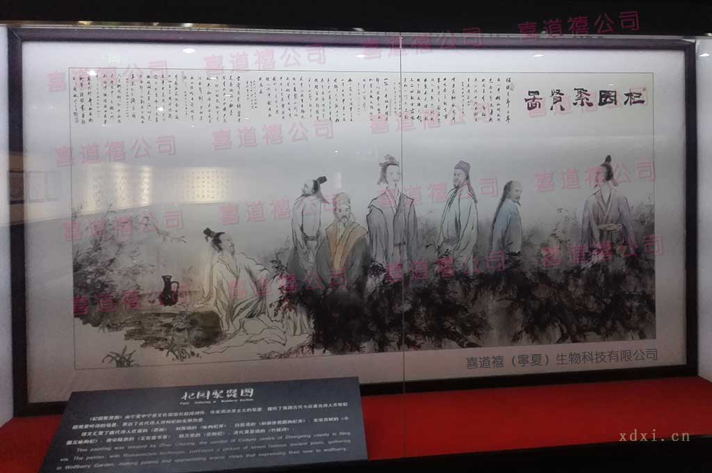 千載原產(chǎn),寧夏載譽。美哉喜道禧,海內(nèi)名品。玆非數(shù)戶之作坊,已成巨額之產(chǎn)業(yè);遙嗅杞薌,如入芳園;觀其晾曬,若臨紅海。藍天白雲(yún),煦日濯溫,以搾水兮柔緩芳干;微施翻抄,以催干兮不傷維素;急入冷房,鼓寒風以鎖鮮;源源凜冽,萃干紅瑪瑙;珠璣入篩,恰上擋下漏,三道五坎,為去瑕分級;瑪瑙落槃,粒粒珠璣紅艷;排若蜂房,陣列雁翎,清香彌散,紅艷氛圍,聞吸芬芳,瞻閱喜氣。鮮杞源源以相出兮,遂入精美之包裝;金匣排排似儲玉璧兮,共嘆名品之堂皇。乃援筆而賦長句兮,讚喜道禧之養(yǎng)生聖品;厲數(shù)十載,堪稱養(yǎng)生珍饈葯食兮,喜萬里之同享。