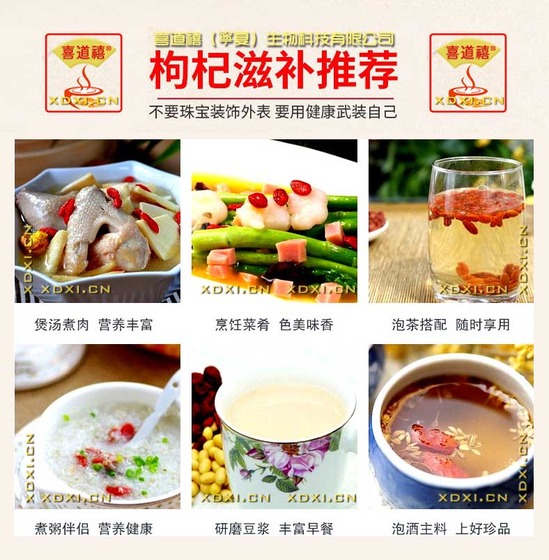 作為藥膳原料時,枸杞的食用技法很多,既可單獨食,又可與其它原料配合使用,做成各種具有不同功效羹、湯、粥、膏、餅、點、菜品等。精品枸杞藥膳,可見本站:"養(yǎng)生中心”/“養(yǎng)生藥膳"。